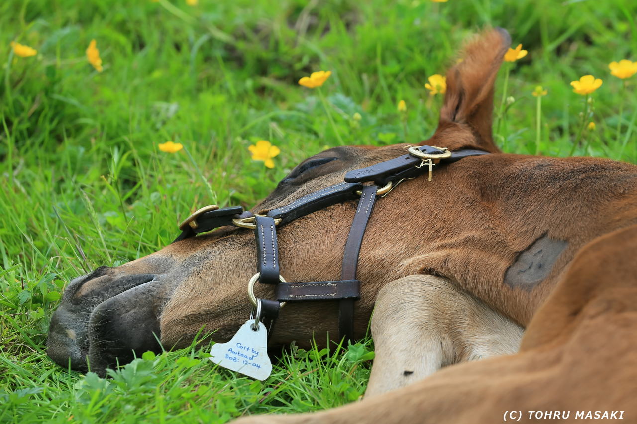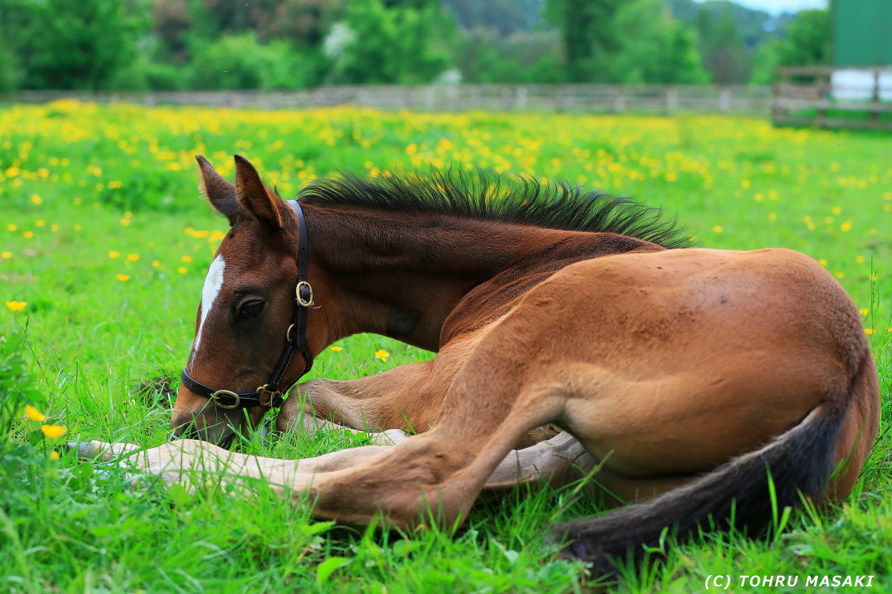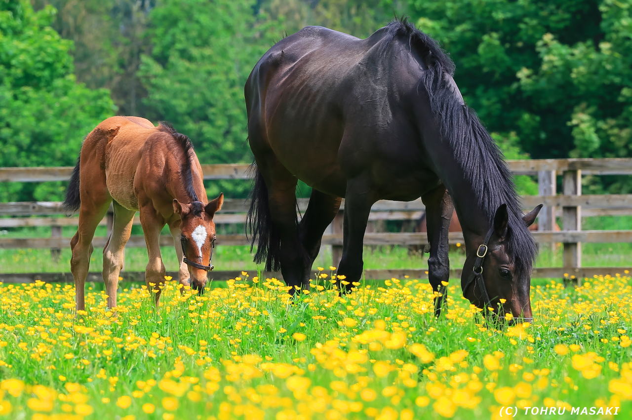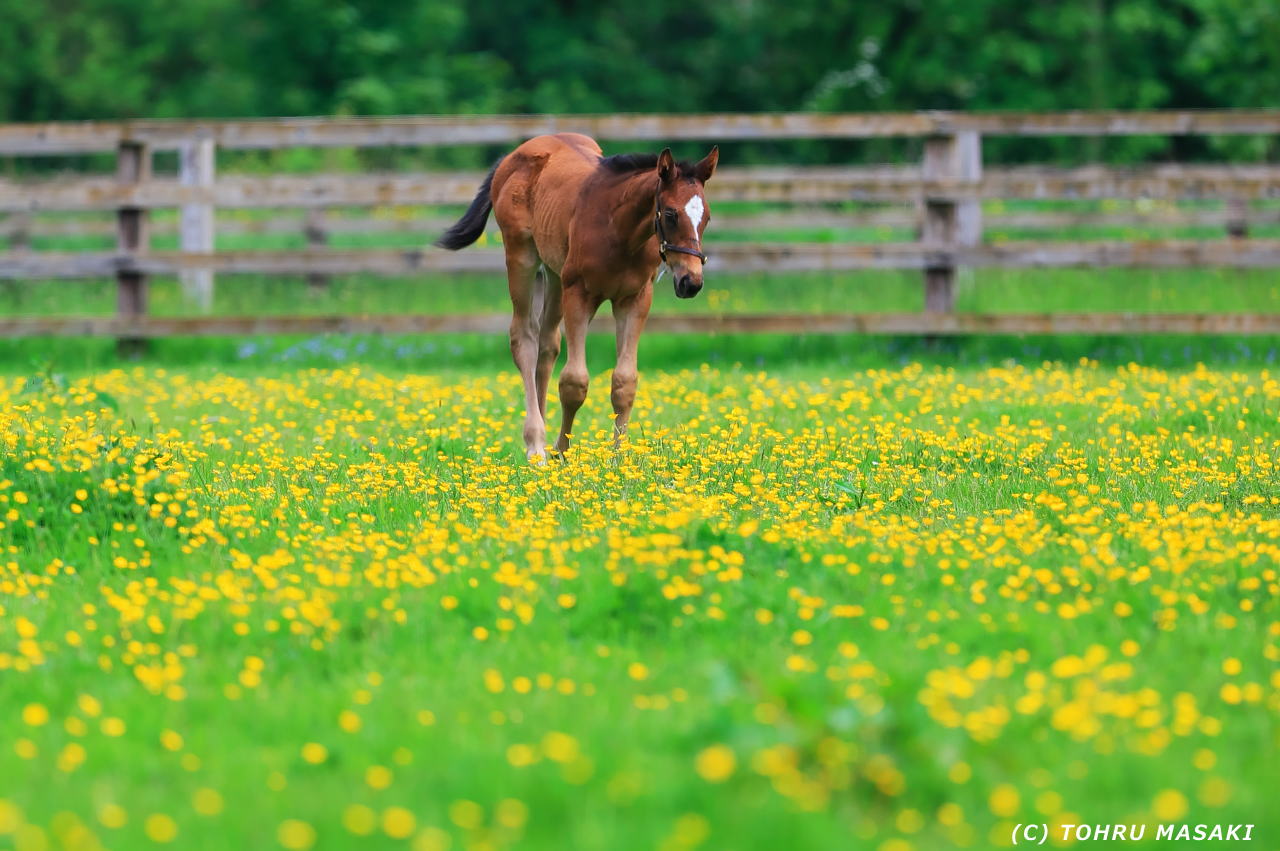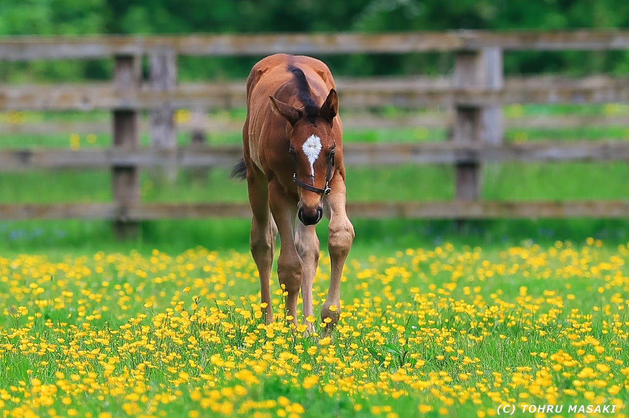 キンポウゲ?のような花畑を仔馬が歩いてます